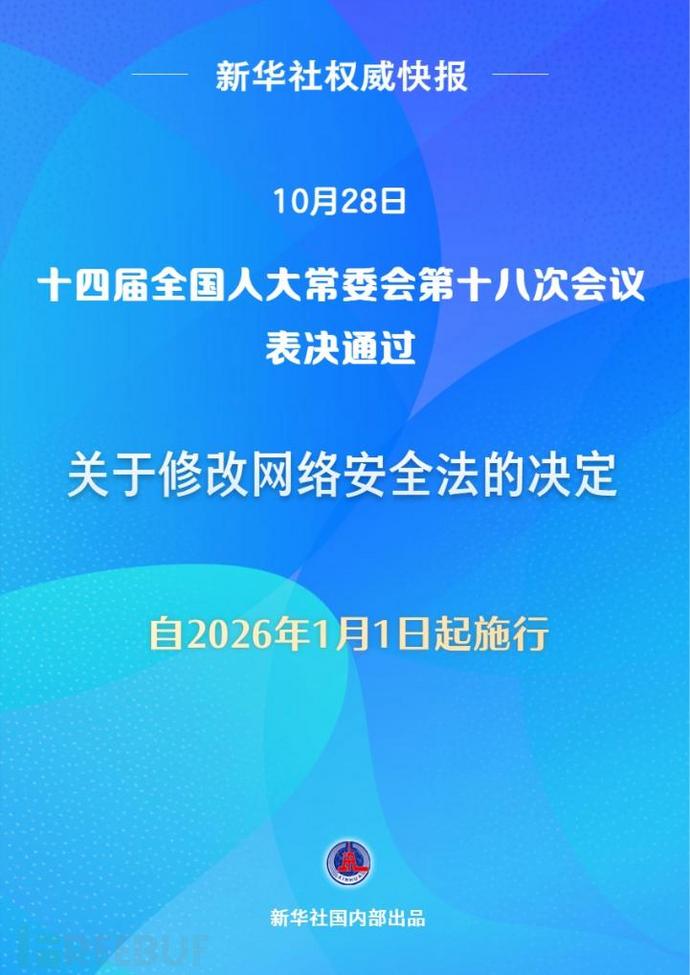 安全, 新闻 网络安全法完成修改,2026年1月1日起施行 2025年10月29日 / 十四届全国人大常委会第十八次会议10月28日表决通过关于修改网络安全法的决定,自2026年1月1日起施行。 201