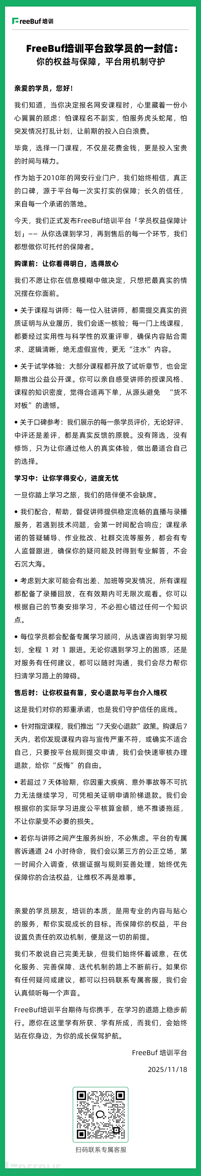 FreeBuf培训平台致学员的一封信:你的权益与保障,平台用机制守护
